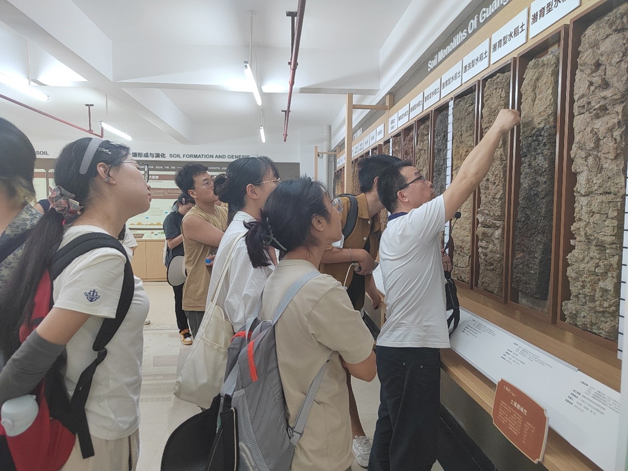 发布时间:2024-09-14 点击量:6699月11日,广东省土壤科学博物馆举办了“土生土长”科普进校园活动,热情接待了来自广州大学地理科学与遥感学院35名师生来馆参观学习。同学们在讲解员的带领下学习了广东土壤科学发展历程,了解到现代科学在岭南这片热土上从无到有的发展历程,参观陈列丰富的土壤标本馆,了解了土壤类型与分布特性,学习土壤标本采集与制作等知识,同学们无不为广东土壤科学家胸怀家国的科学精神所折服,种类丰富的土壤标本和岩石标本也让人惊叹。参观过程中,同学们积极思考并与讲解员进行互动交流,通过参观学习也切实感悟了“认识土壤、热爱土壤、守护土壤”的理念,并将此后在专业学习上进行应用。