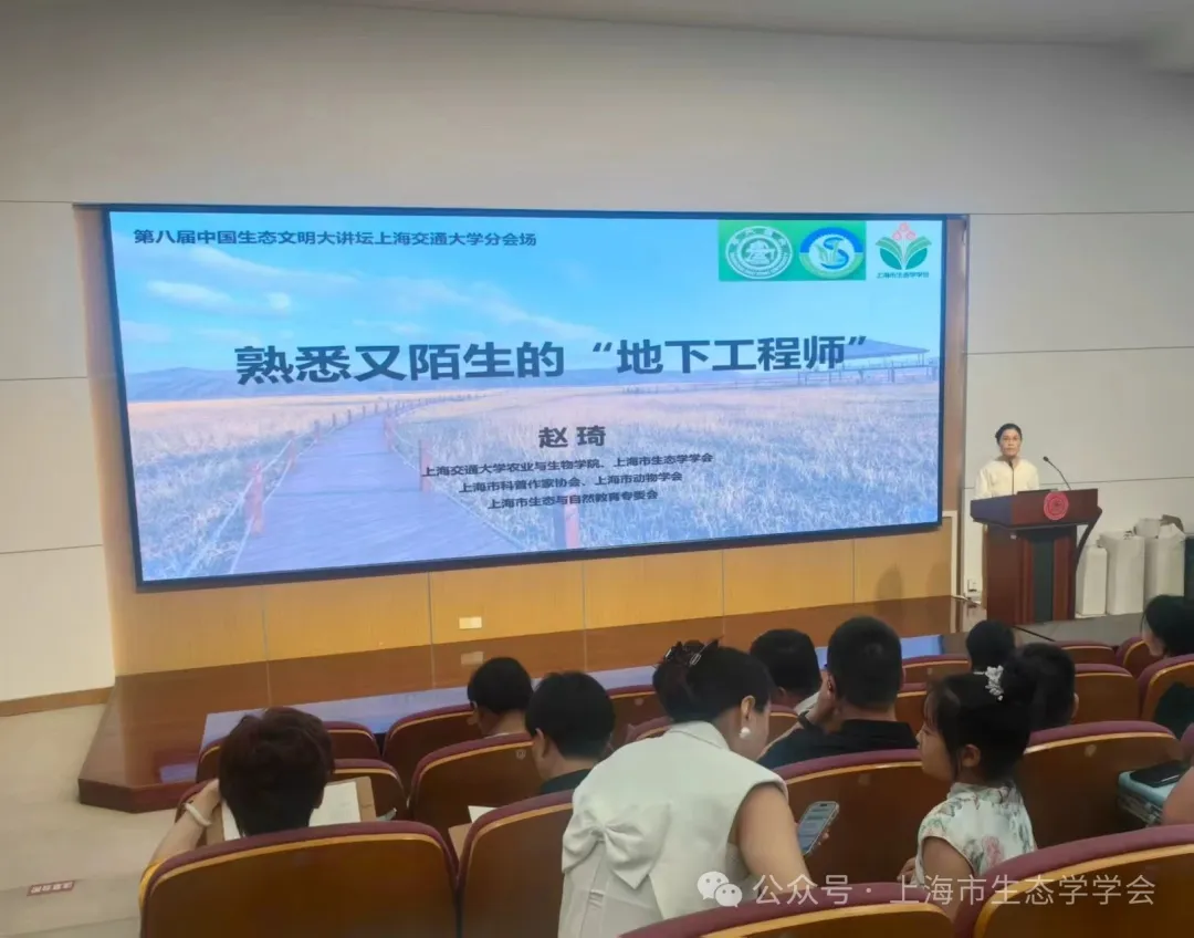 发布时间:2025-08-26 点击量:3712025年8月19日,以“脚下的奇迹,盘中的未来”为主题的科普活动在“第八届中国生态文明大讲坛”分会场之一上海交通大学农业与生物学院进行。该活动通过讲座和实践的形式,带领青少年们深入探索从土壤动物到生态农业的奇妙旅程。上海交通大学农业与生物学院副教授赵琦以“熟悉又陌生的地下工程师”为题,向青少年们揭示了那些常常被我们忽视的生物,尤其是蚯蚓,是如何通过它的超能力,默默维系着土壤的健康与活力。她提出,维护我们共同的生态环境的平衡和可持续发展并不仅仅是科学家们才能做的,我们人人有责。