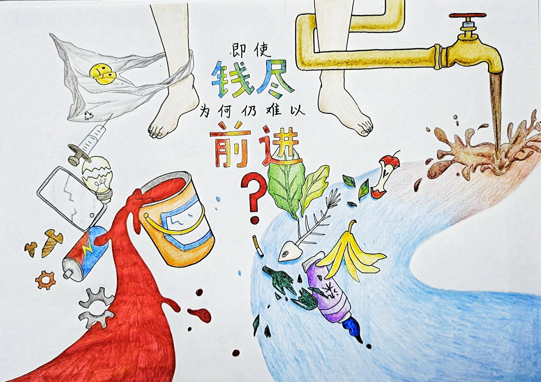 发布时间:2022-05-25 点击量:557本绘画作品以“?;せ肪常芫遗怕曳拧蔽√?,生动地把排放到河流以及大自然环境中的污染物化作束缚在人类脚上的枷锁,并附上“即使‘钱尽’为何仍难以‘前进’?”的发问,阐述了人类若肆意排放污染物、丢弃废品,即使经济再发展也将寸步难行的道理。