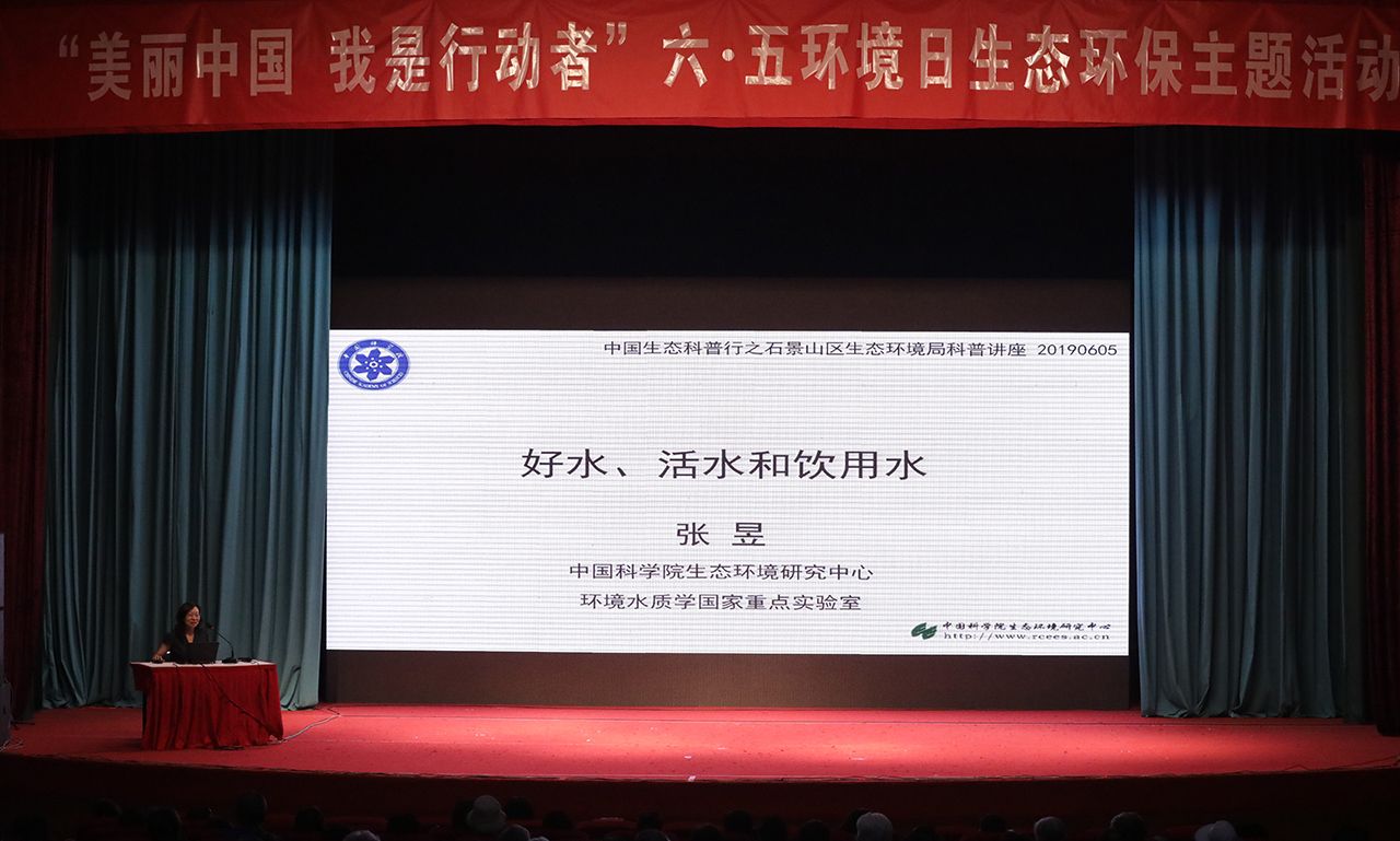 发布时间:2019-06-06 点击量:14052019年6月5日第48个世界环境日,受北京石景山区生态环境局的邀请,微生物生态专业委员会主任委员、中科院生态环境研究中心张昱研究员为石景山区生态环境局主办的“美丽中国,我是行动者” 2019年六·五环境日主题宣传活动进行环保科普讲座。此次科普讲座也是科普工作委员会组织的中国生态科普行的系列活动之一。张昱研究员用生动的案例,浅显易懂的语言为大家带来了关于“好水、活水和饮用水”的科普讲座,这一场与民生息息相关的水环境科普讲座,让观众了解到什么是好水、活水、水污染及控制原理、日常饮用水的由来及选择方式等丰富的水和生态相关科普内容